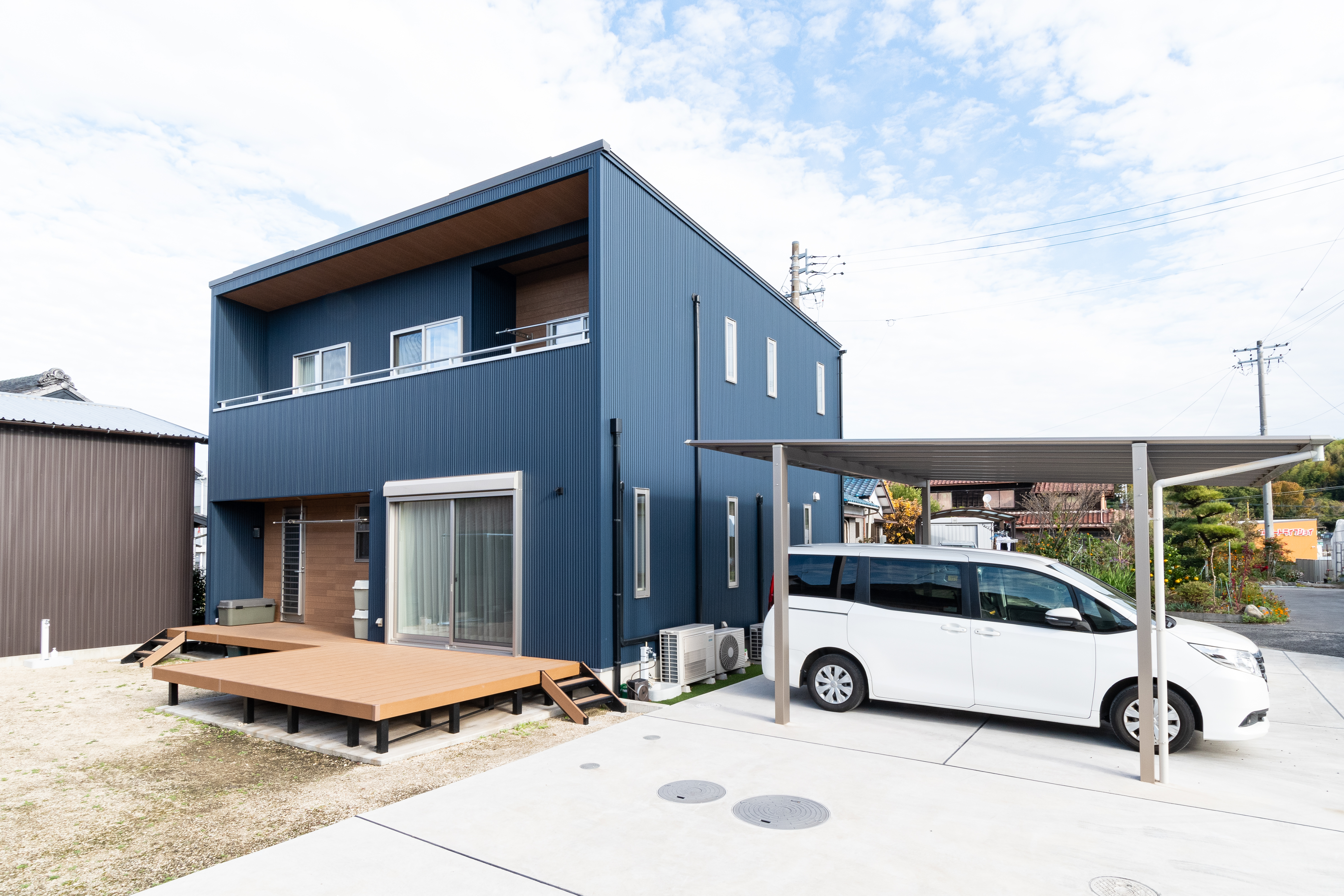 外壁にガルバリウム鋼板を採用し一部木目の窯業系サイディングをアクセントにしたシンプルモダンの外観。