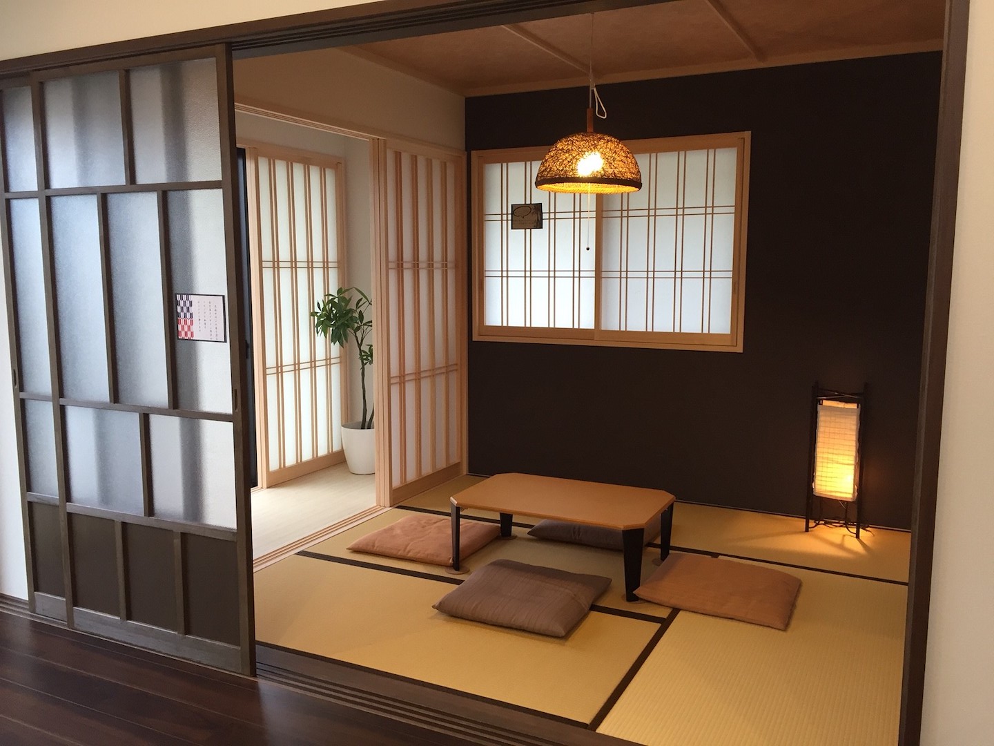 あと、ティンバーや丸窓から見える有松絞りのライト、ビンテージの鎧一式などですね。