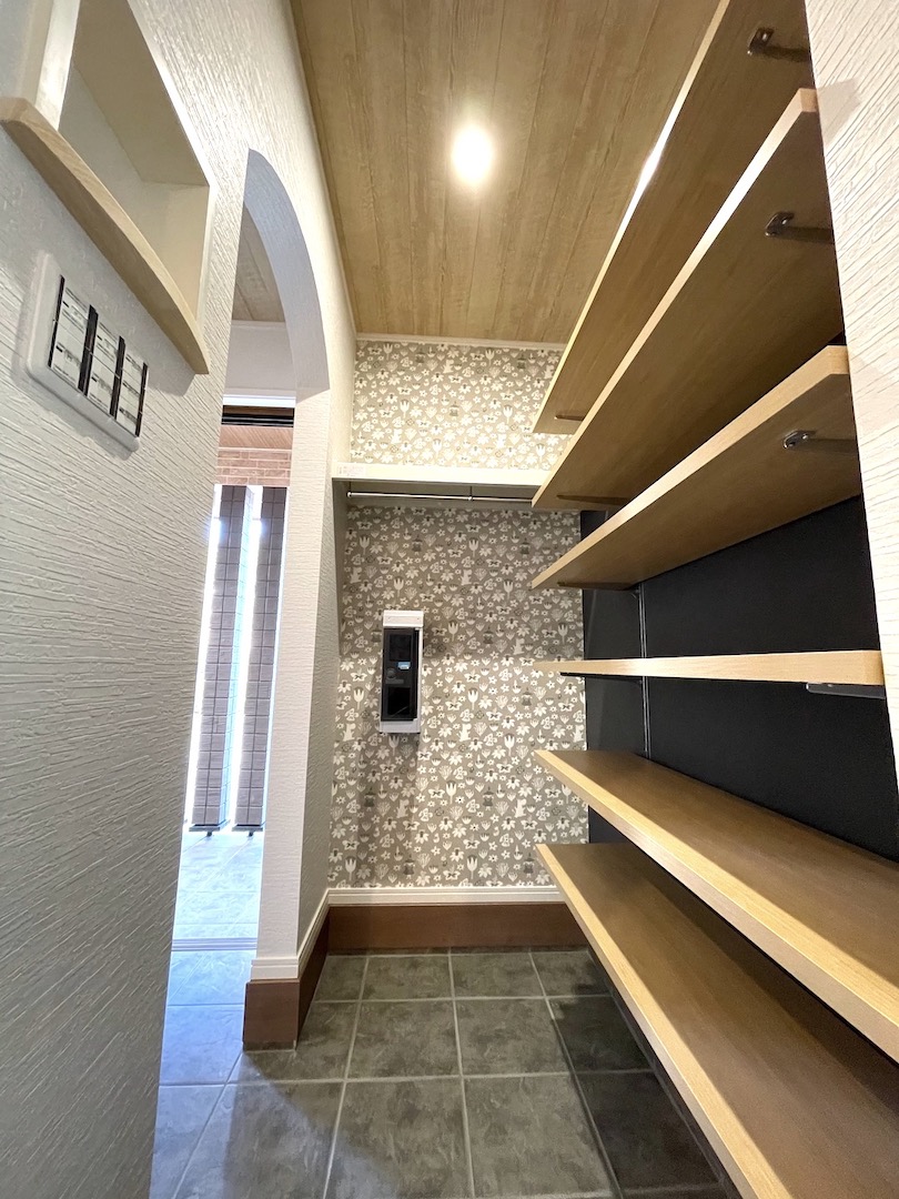 大容量の収納、シューズクロークを備えた玄関。