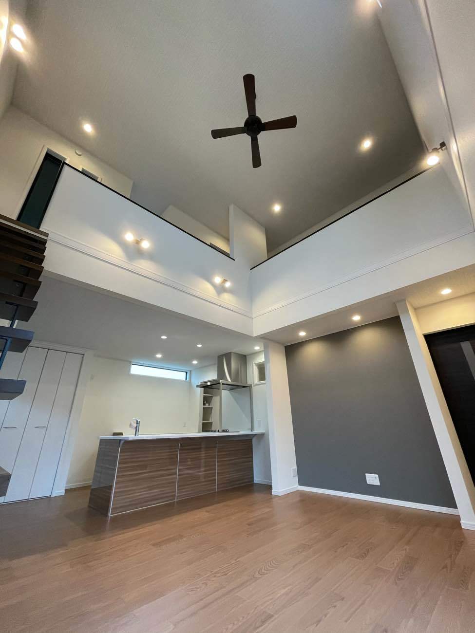 吹き抜けの高い天井が開放感を演出するLDK。