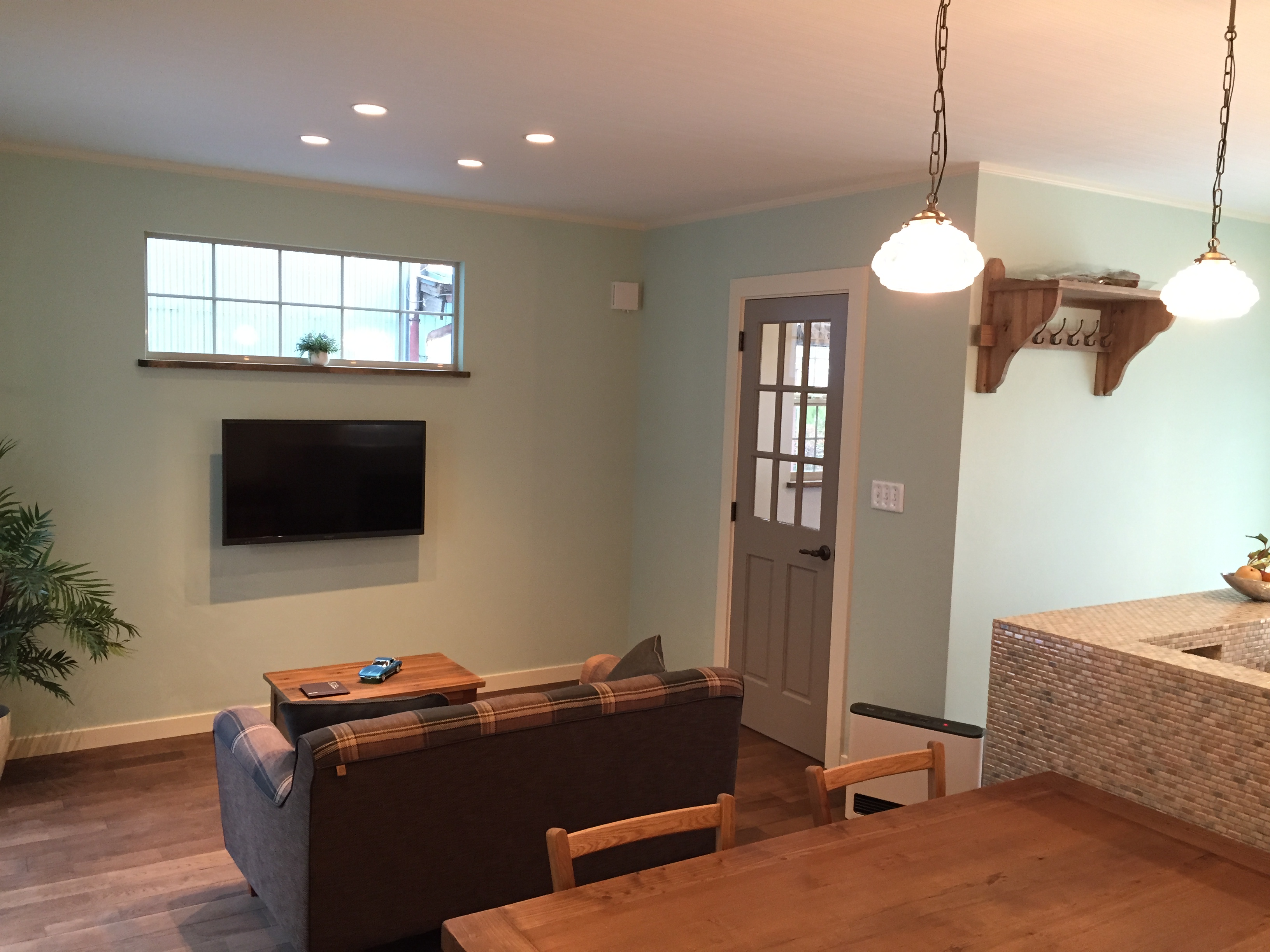 ミントグリーンのクロスにブルーグレーの室内ドア、ヴィンテージ風のペンダントライト。