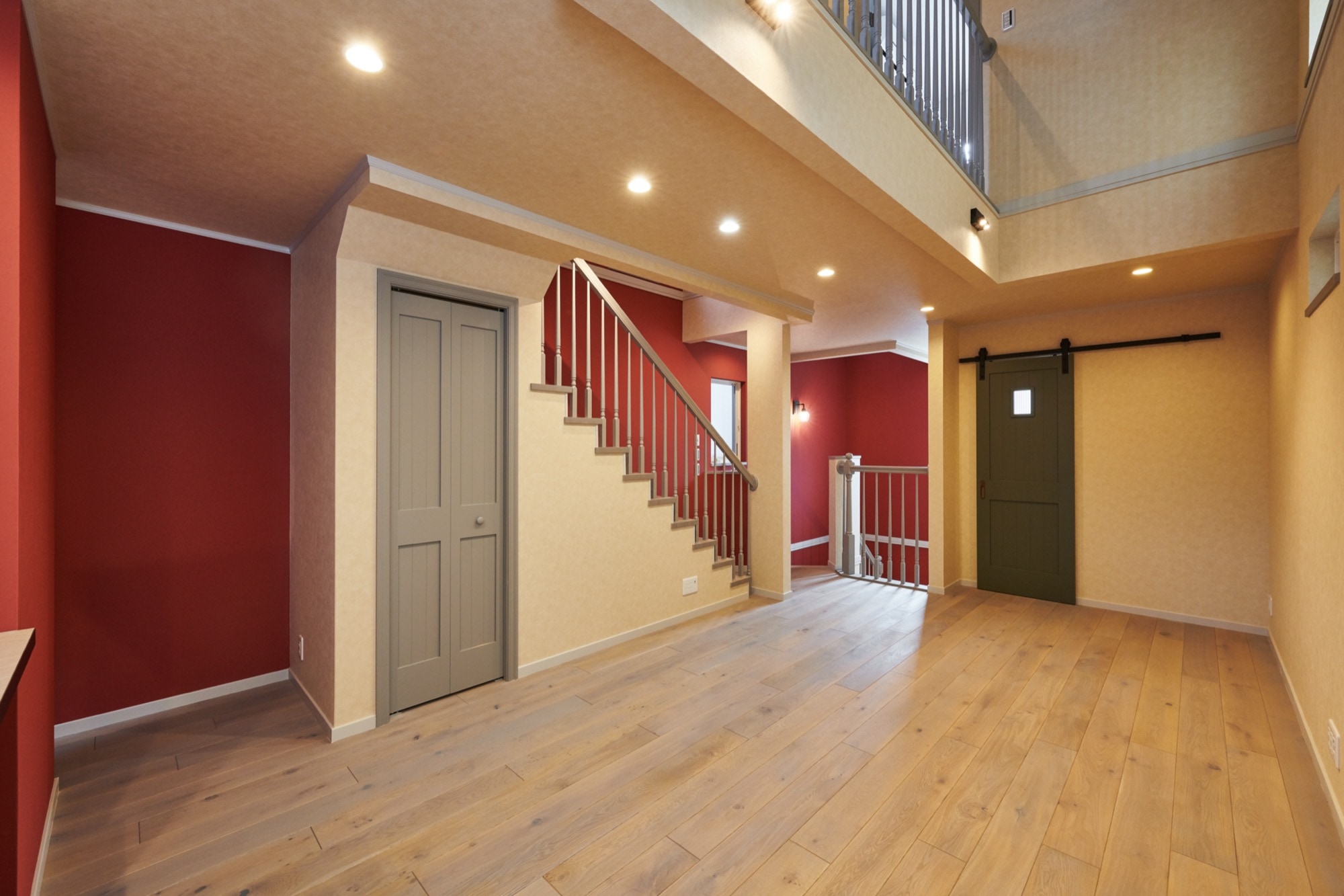 濃赤のクロスやブルーグレーの室内扉など、カラーリングは上級者テクニック!