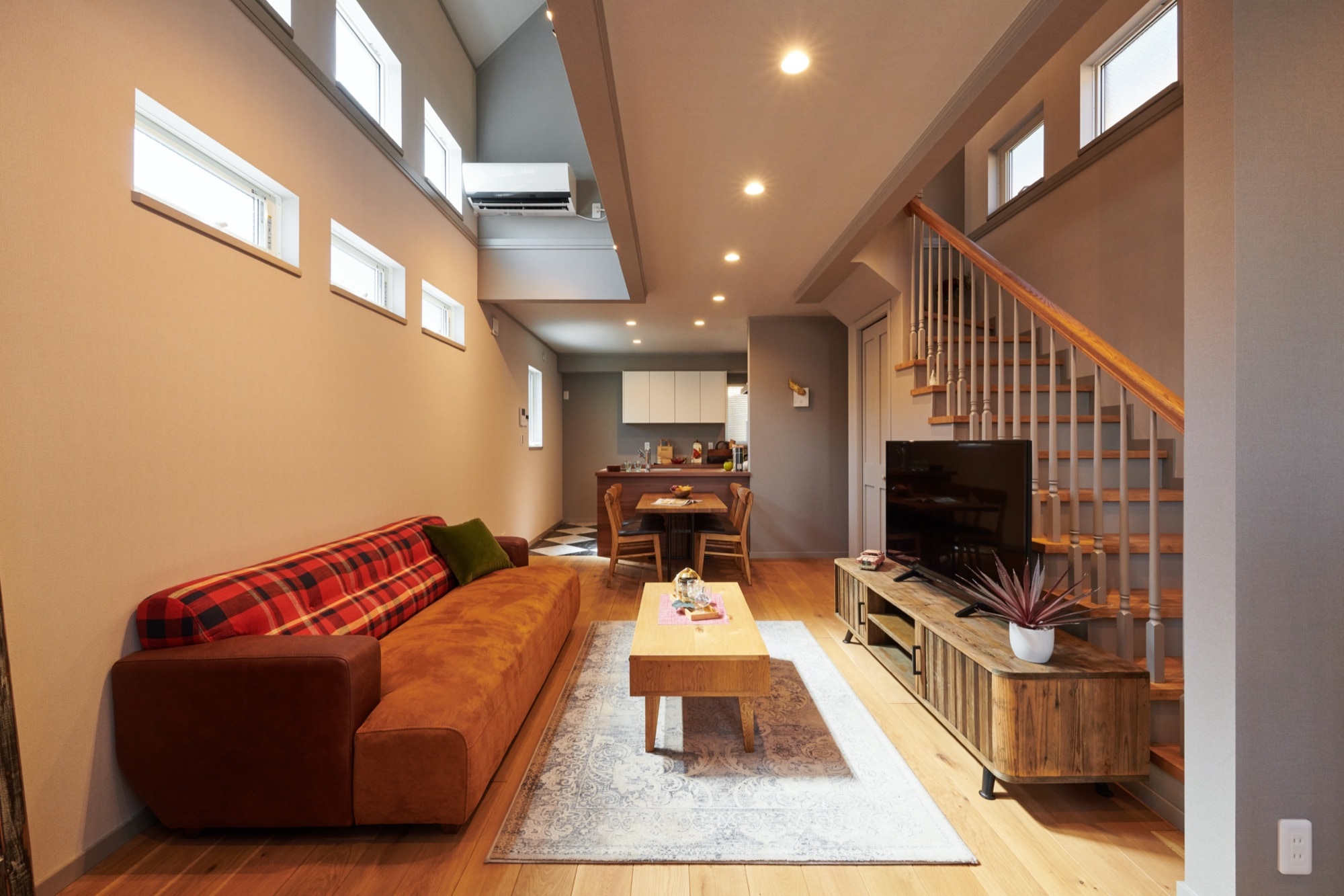 縦長のリビングは階段と並行、上半分を吹き抜けにして上部に窓をたくさん設置することで、