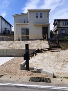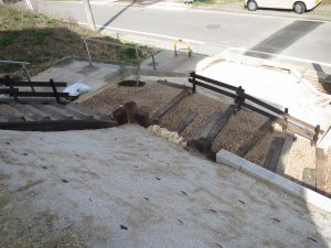 高低差の有る敷地ですが、階段アプローチは枕木を使用し、サイドには芝を植え