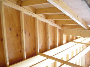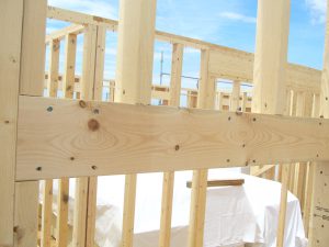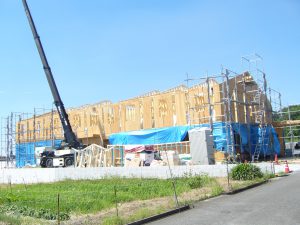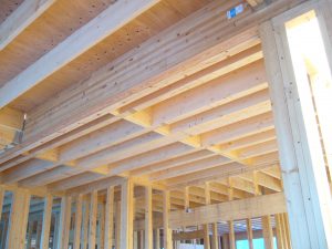 2階建ての場合 1階の床→1階の壁→1階の天井下地(2階の床下地)→2階の床→2階の壁→2階の天井下地→小屋組→屋根下地→屋根板貼り 下から順番に立ち上がっていきます。