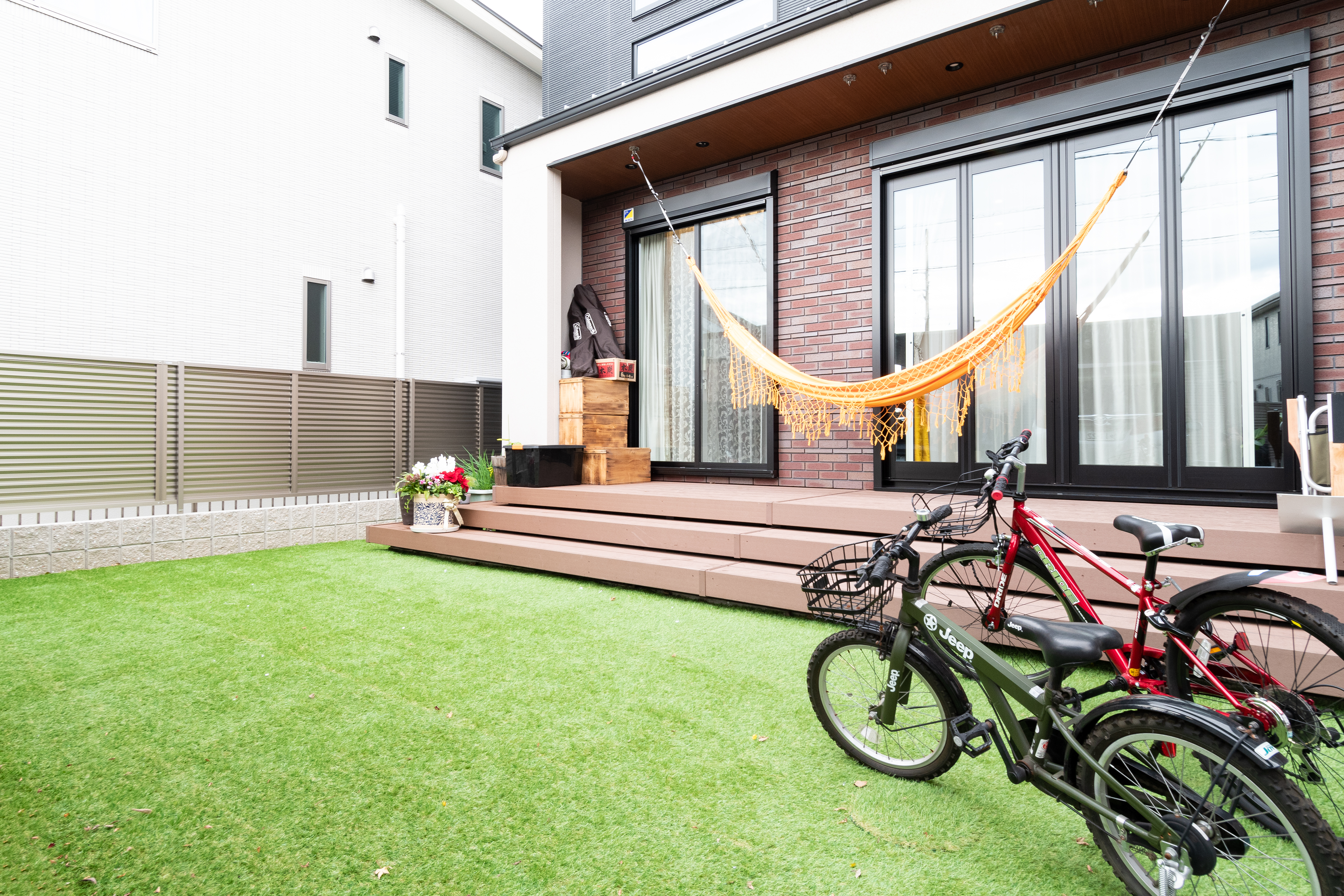 365日楽しめるお家 特徴1:家事動線 家族の使い勝手を考え、家事を効率よく終わらせ趣味の時間・家族の時間にまわすことができます! 特徴2:人工木デッキ&ガーデンスペース 天気が良い朝はデッキにでて朝ヨガをし、疲れたらユラユラとハンモックでのんびりタイム。 子供たちが遊んでいても外からの目を気にせずにはしゃぐことができます♪ 特徴3:洗濯スペース 2階に洗濯スペースを施工し洗濯を回す・干す・収納が出来るスペースになっているので 無駄な動きがなく洗濯を終えることができます!