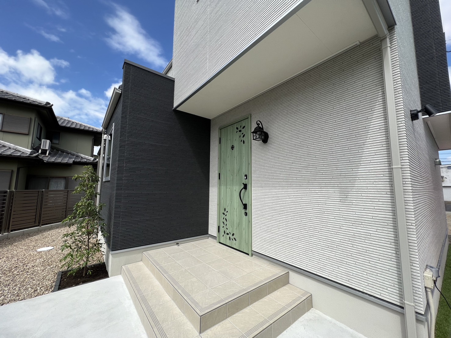 玄関ドアは緑系、外壁は白系で可愛らしいデザイン