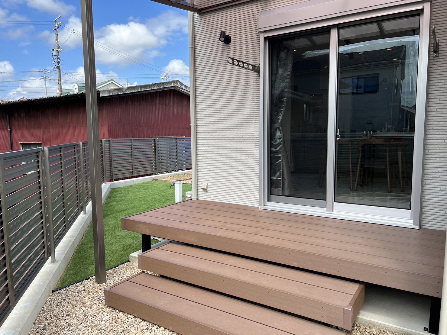 ウッドデッキがありお庭も人工芝である為、犬が走り回ることが出来たり