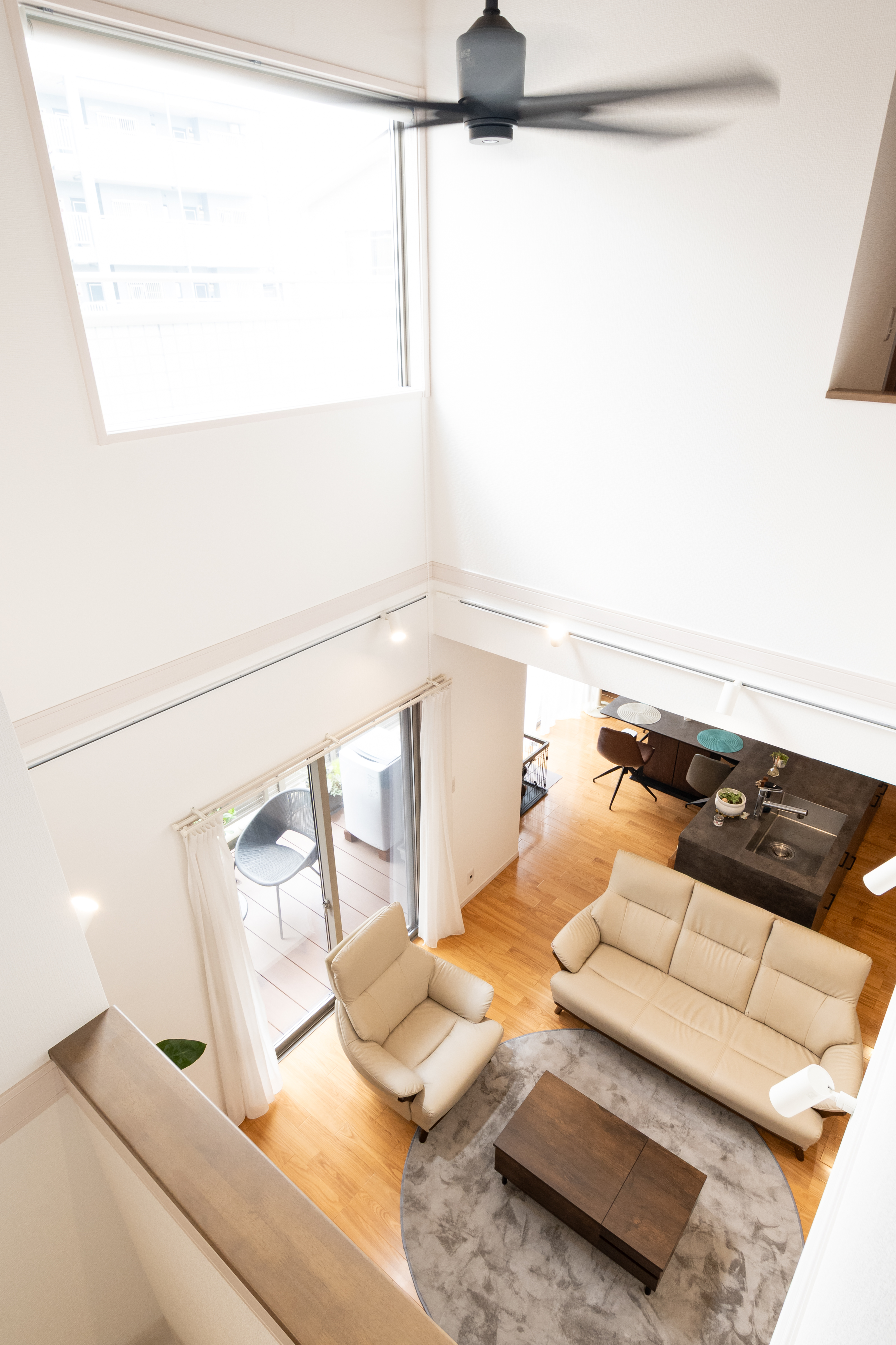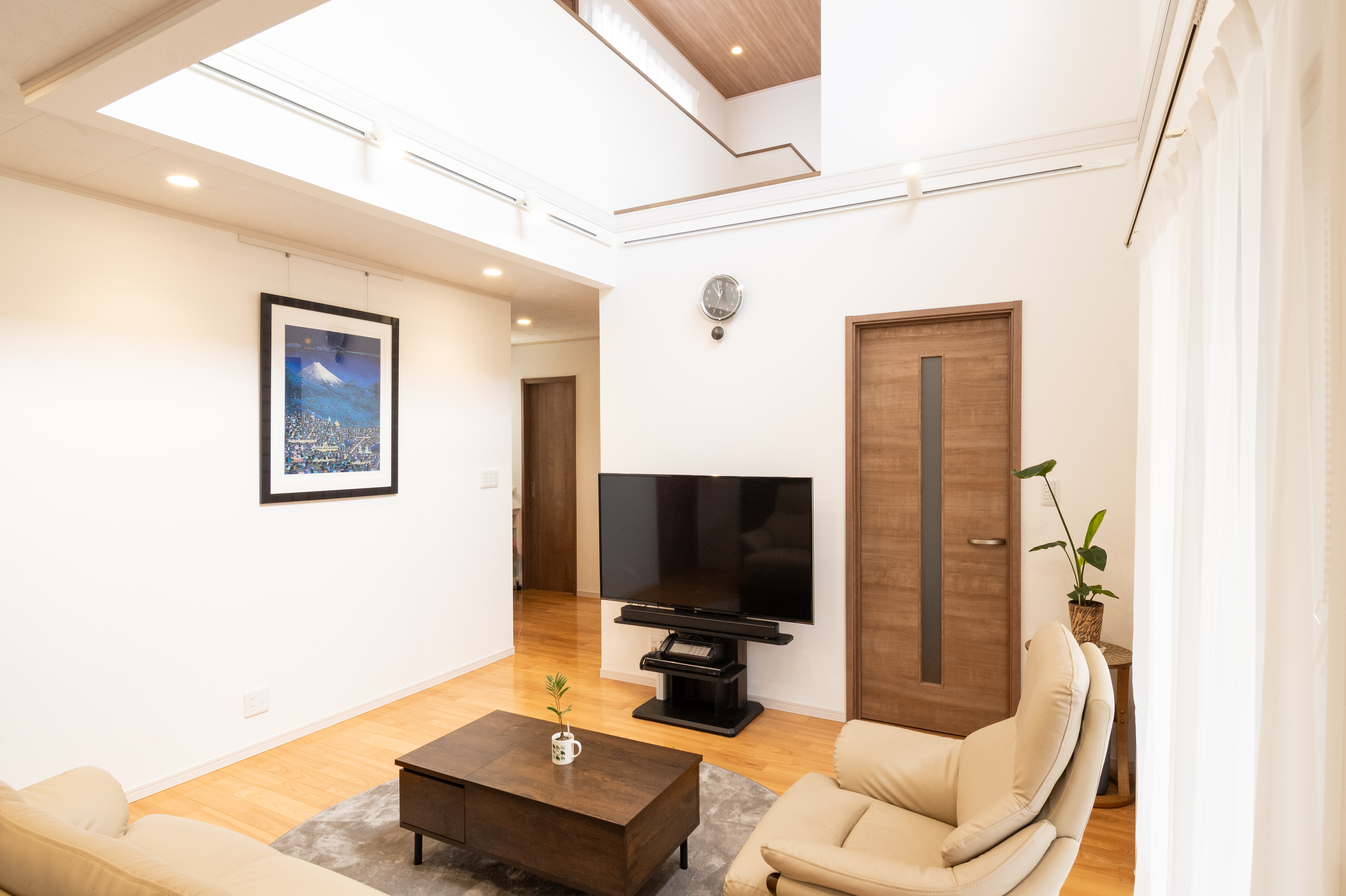 開放的なリビングは吹き抜けにし、太陽の光が差し込んで明るい空間となっております。