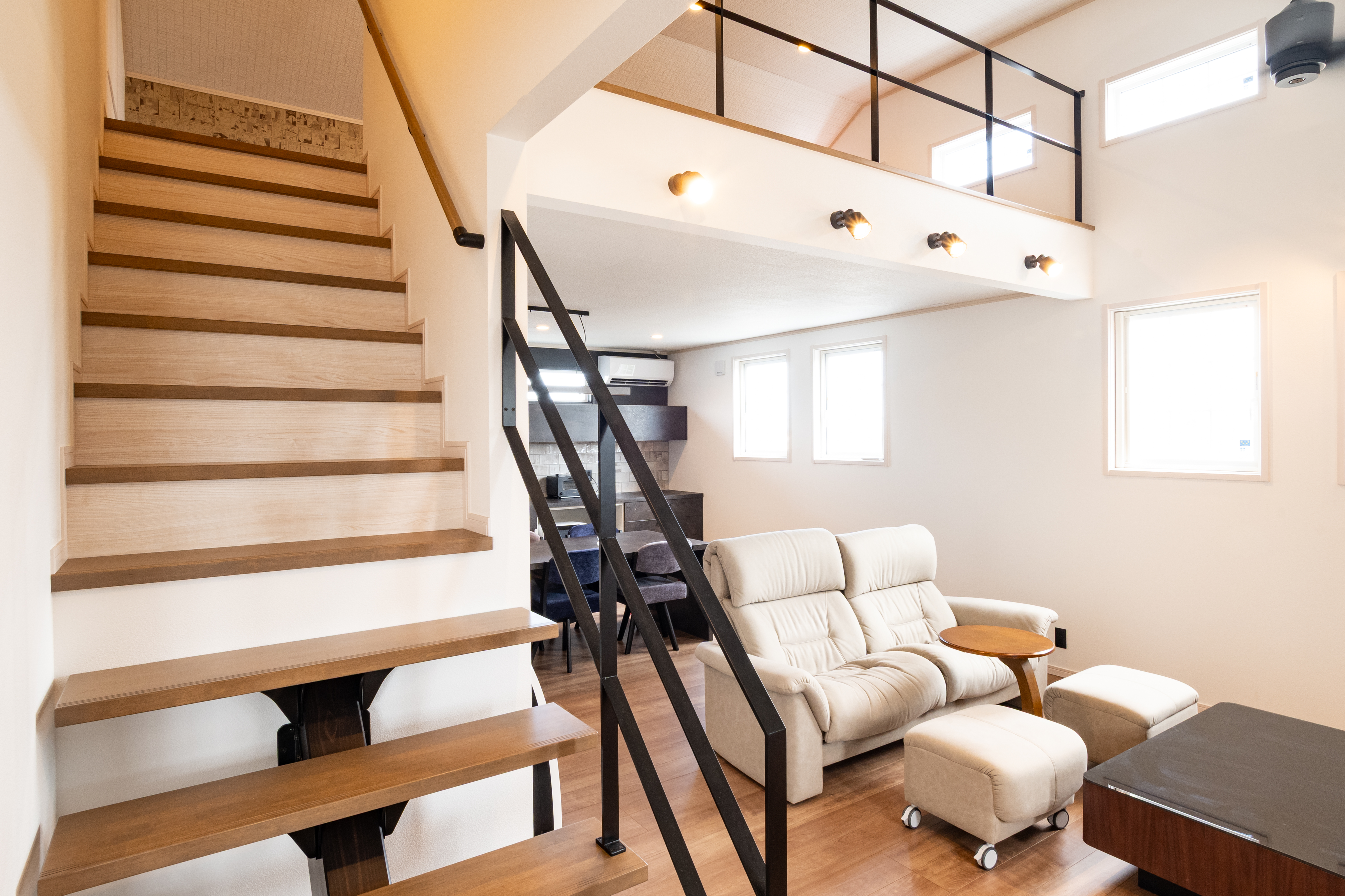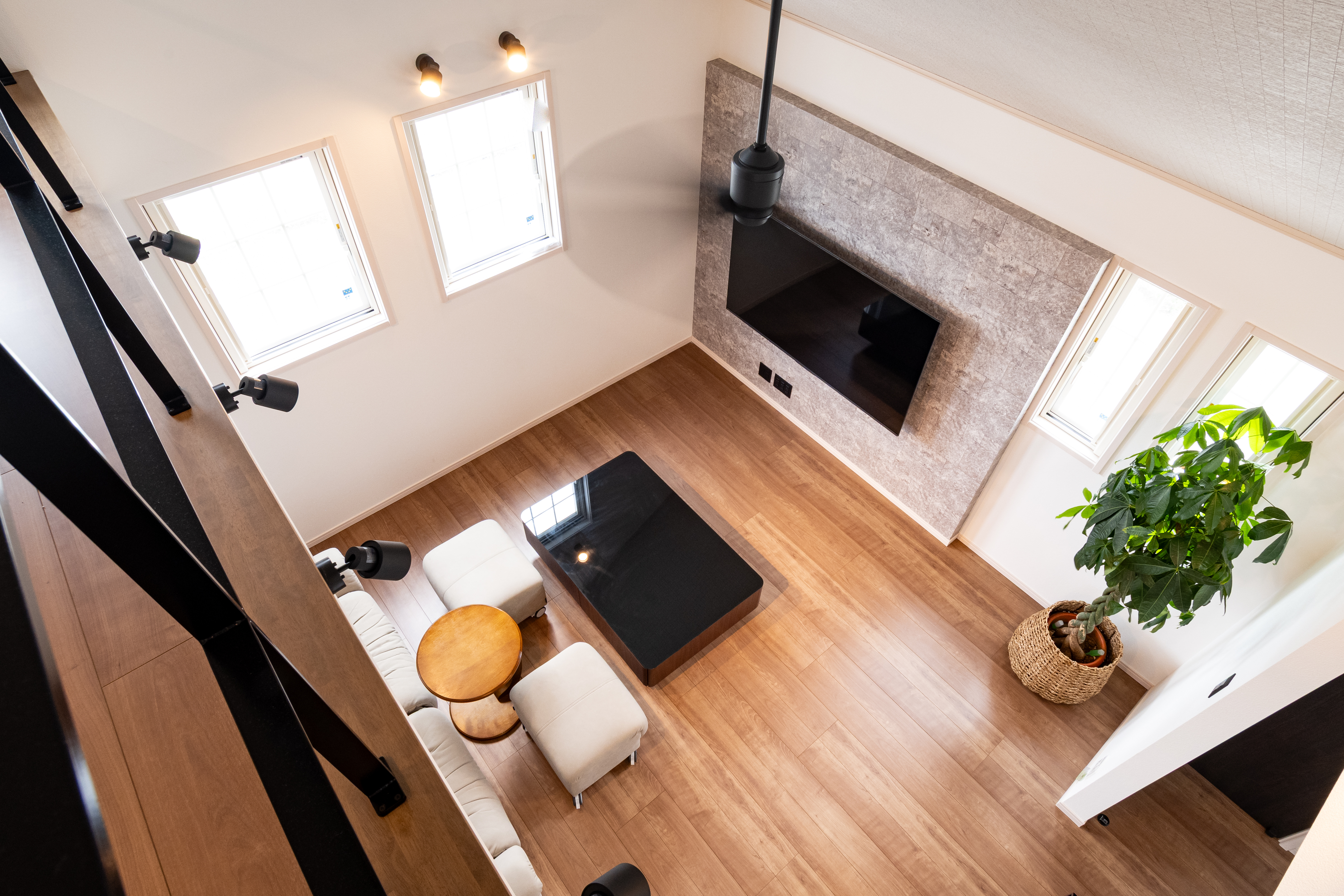 ゆったりすごす家族時間 特徴1:大きなロフト 約7.4帖の大きなロフトは子供もノビノビできるくらいの広さがあります。 収納スペースとしても利用可能です! 特徴2:リビング リビングは吹き抜けにして開放感あふれる空間に! シーリングファンを回すことにより空気の循環をして部屋全体を同じ温度感にすることができます。 特徴3:ビルトインガレージ 雨にぬれずにガレージから直接玄関に入ることが可能! ガレージ内には収納を設置し車用品や趣味の物を保管することができます。