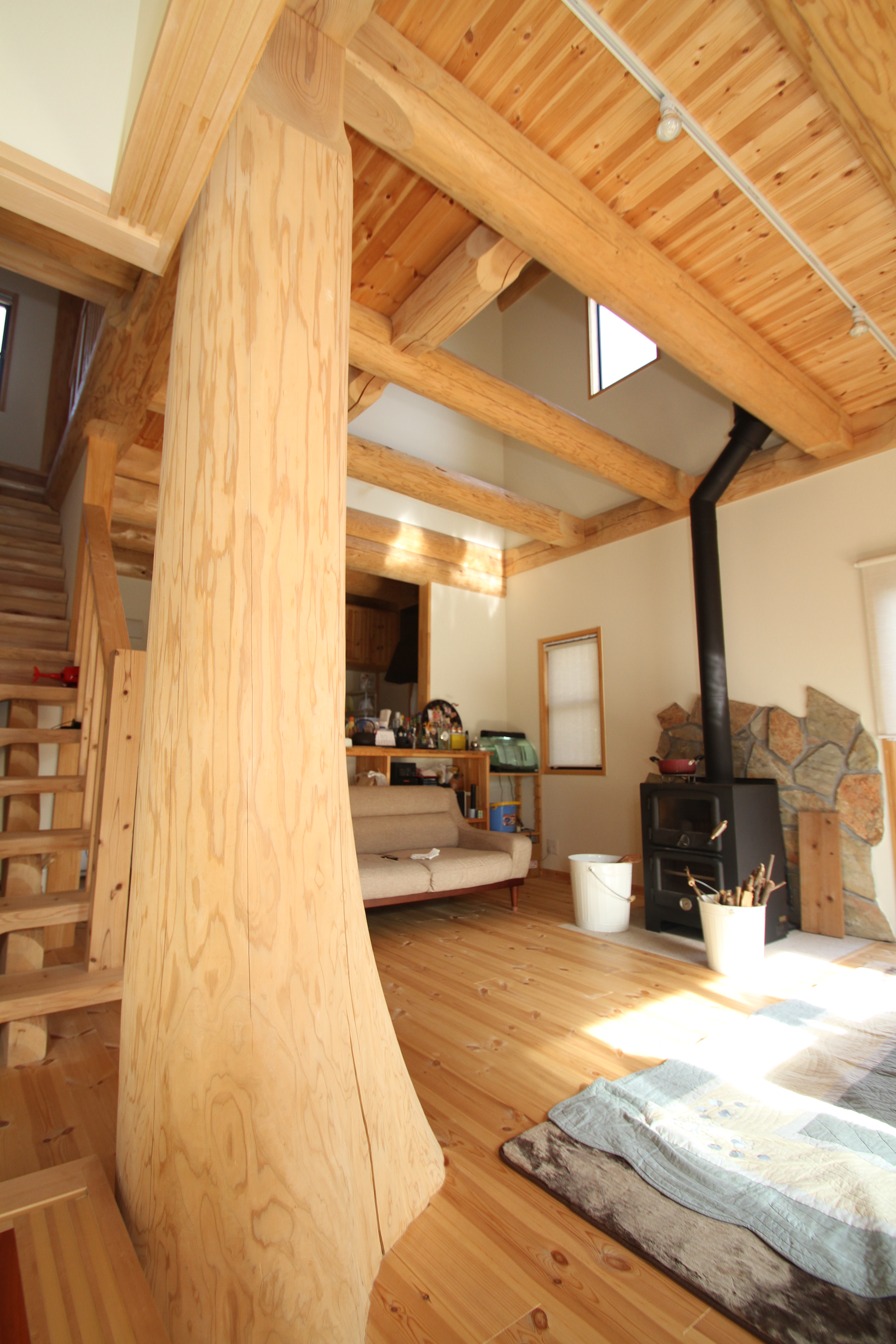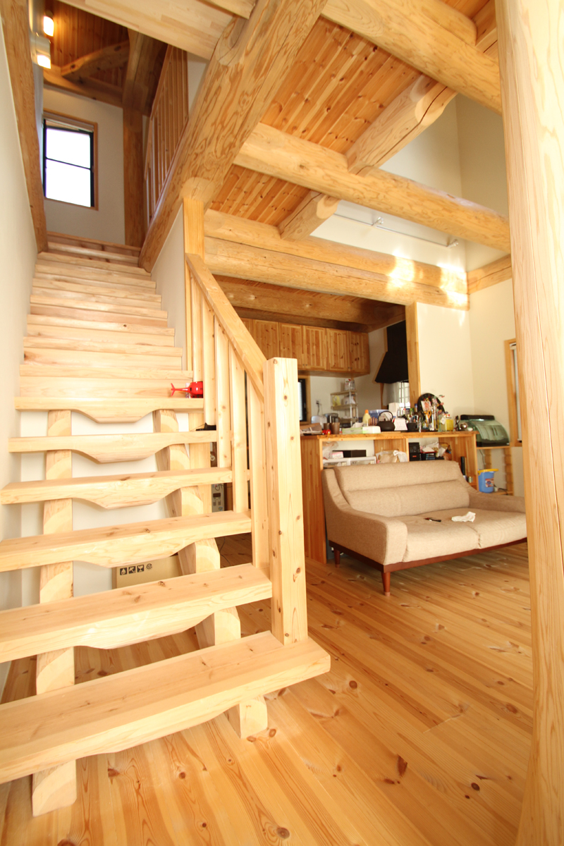 丸太を半割りにした階段は、一段一段を安心して上り下りできるように重量感を出しました。また、シンプルな造りにし、開放感を演出しています。